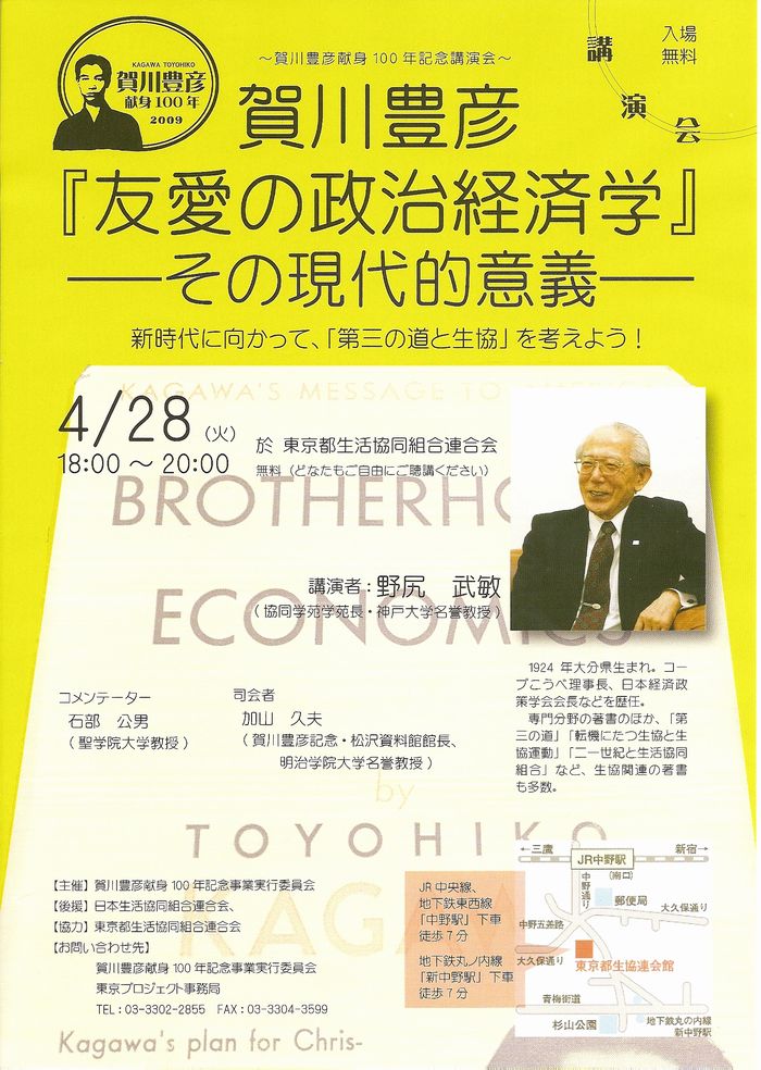 トップ>パンフレット 講演会 賀川豊彦「友愛の政治経済学」−その現代的意義 講演会 野尻武敏協同学苑長