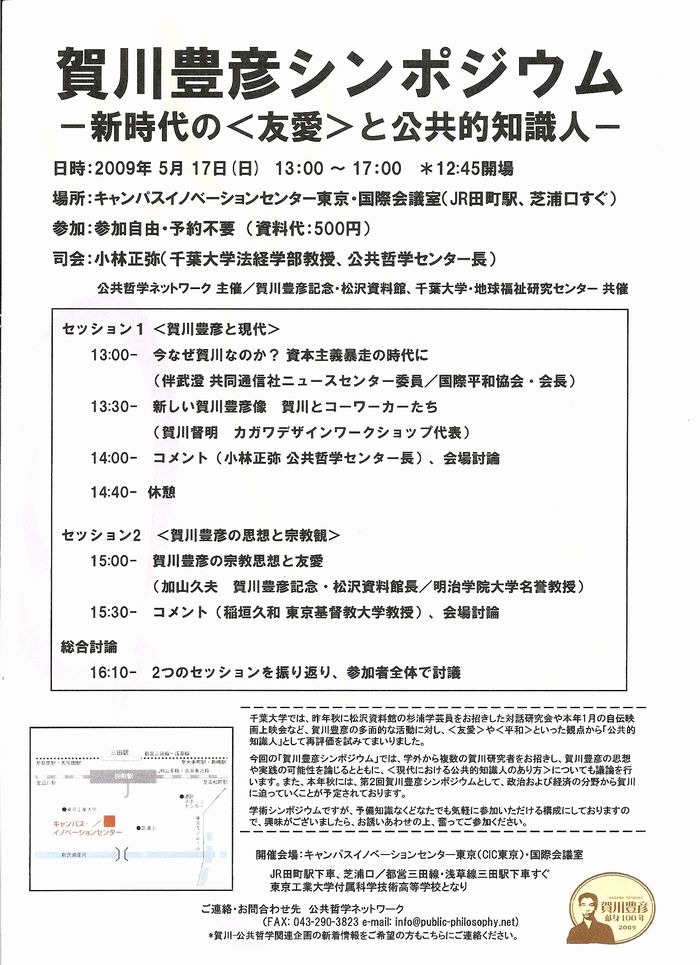 賀川豊彦献身100年記念事業実行委員会 東京プロジェクト 事務局 〒156-0057 東京都世田谷区上北沢3-8-19 賀川豊彦記念 松沢資料館内 神戸プロジェクト 事務局 〒651-0022 神戸市中央区元町通5-1-6 神戸共栄火災ビル7F