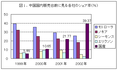中国大陸における携帯電話メーカーは1997年の5社から2002年には37社に増加した。その大半は北京、天津を中心とする「北方基地」(9社)、揚子江デルタ地域の「華東基地」(6社)、そして広東省を本拠地とする「南方基地」(9社)に集中している。